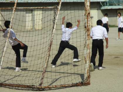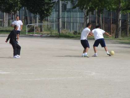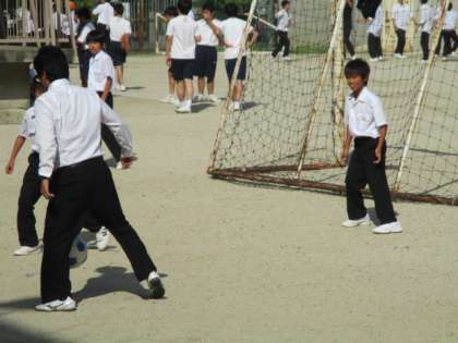 元気に遊んでいます。先生も一緒にサッカーをしています。