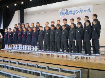 先週、21日(金)に行われた1年合唱コンクールで1組の写真と2組の写真を間違って掲載してしまいました。1組の生徒の皆さん、保護者の皆さんそして見ていただいた方々にご迷惑をおかけしました。すみませんでした。この写真が1年1組です。