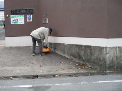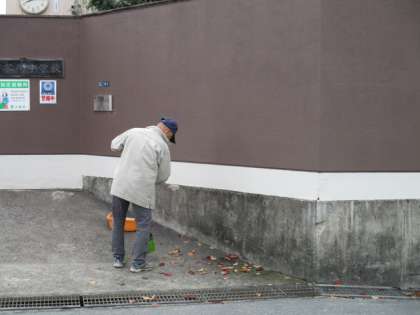 学校整備員さんが校門付近の桜の落ち葉を丁寧に拾っていただいています。
