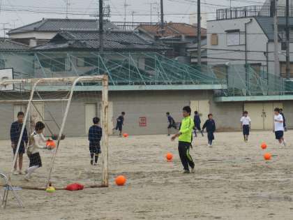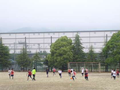 あいにくのお天気ですが、グラウンドではサッカー部が練習に励んでいます。