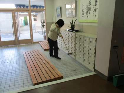 寒い中、校務員さんが玄関の清掃をしてくれています。