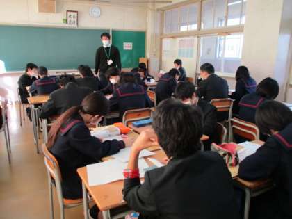 社会の授業(3枚目の写真)では、学習班で協力しながら、受験対策のプリントに取り組んでいました。