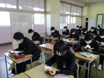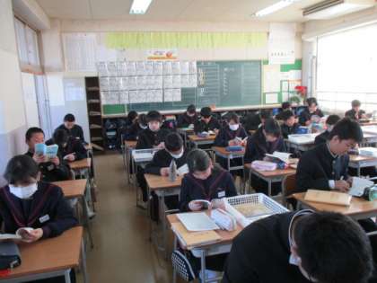各学年の朝読の様子です。2年生がインフルエンザで学校をお休みする生徒が出てきました。先週末、校外学習に行ったので想定はしていましたが、今日から授業は全員マスク、換気、給食前の手の消毒を強化します。