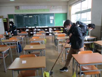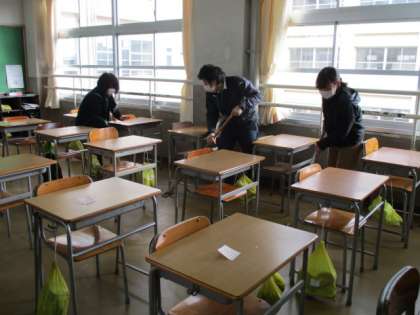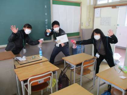 6限に学年主任の河合先生、4組副担の浅松先生、保健室の田中先生が4組教室の清掃、消毒を懸命にしてくれています。本当に嬉しいですね。4組の皆さん、北端先生、月曜日に待っていますからね。