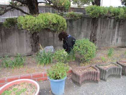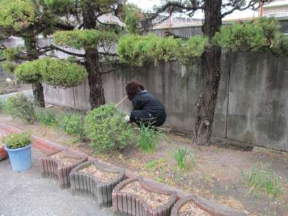 肌寒い中、校務員さんが校門付近の草抜きをていねいにしてくれています。校門・玄関は谷川中学校の顔です。