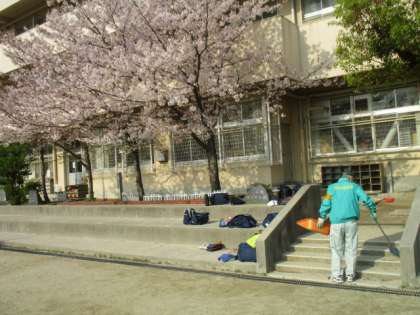 落ちた桜の花びらをていねいに学校整備員さんが清掃していただいています。
