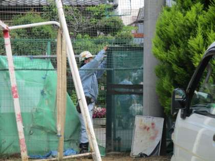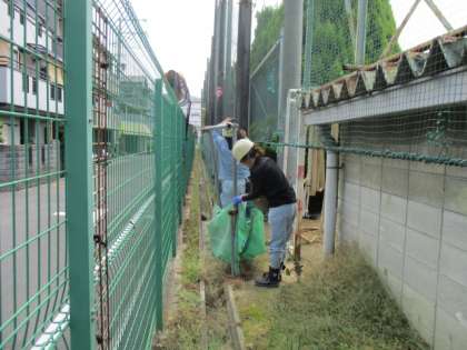 運動場北側の防球ネットが破損していたのを教育委員会の計らいで、今日から業者さんが修理していただいています。