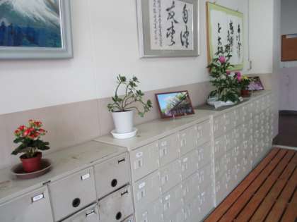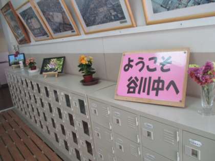 自慢の玄関にはお花、写真が飾られています。校務員さんが職員の下足箱も一人ずつ