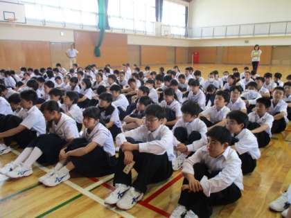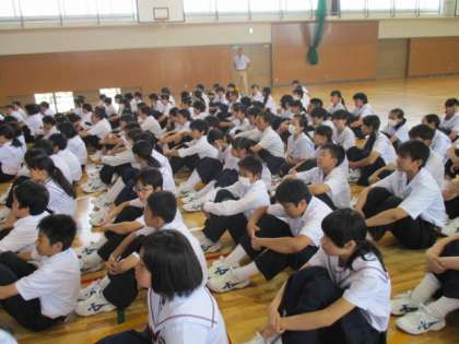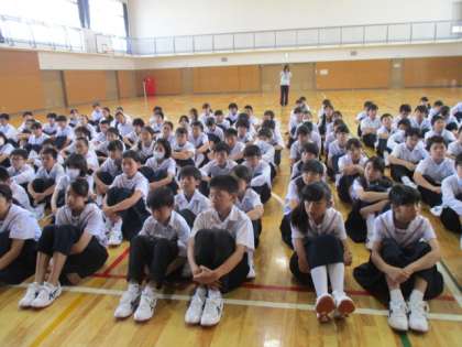 1年生の学年集会です。6月3日の校外学習に向けて、集団行動の練習と諸注意がありました。