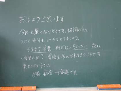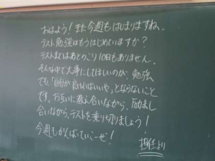 1年生の黒板には毎朝、担任の先生からクラスの生徒にメッセージが書かれています。
