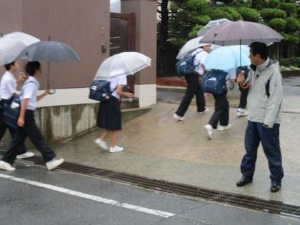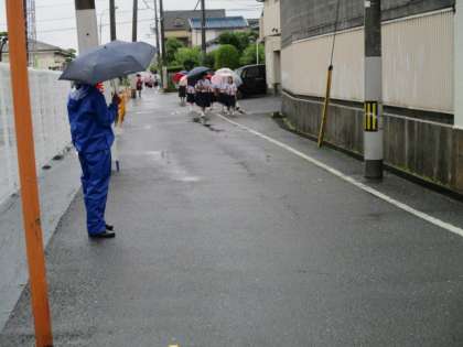 地域の野村さん、中川さんはこんな悪影響な天候にも関わらず、カッパを着て生徒たちを迎えていただいています。本当に感謝です。