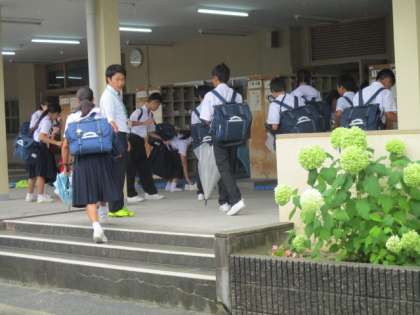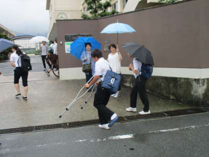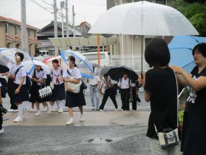 今日は朝から雨が降り、蒸し暑い1日になりそうです。保護者の方々も朝のあいさつに参加していただいています。