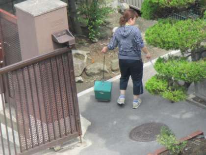 校務員さんが校門付近の隅々まで丁寧に清掃をしています。