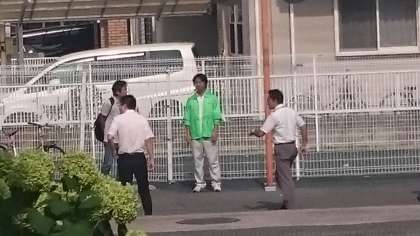 地域の方が8時30分以降も遅刻してくる生徒を本校の教師と一緒に迎いいれて