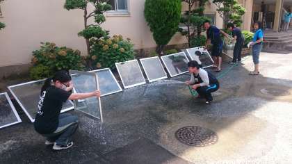 職員室の窓を外して水をかけて、拭いています。○○先生がホウスを持って大喜びです!!