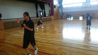 女子バスケットボール部が準備運動に入っています。