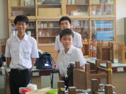 科学部の活動様子と吹奏楽部が楽器のお掃除をプールサイドでしています。