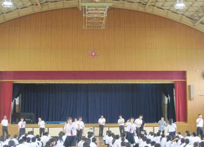 3年生は1限、学年集会を開いて、修学旅行に向けて校風点検や集合隊形の練習をしました。