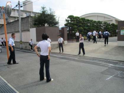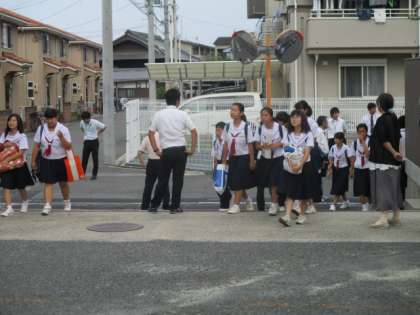 生徒たちは多くの先生や地域の方に迎えられて学校に入ります。