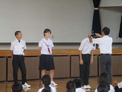 1学期終業式、8月に空手世界大会に3人の生徒が出場するということで、激励会を行いました。