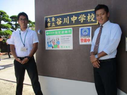 朝、生徒たちを迎入れてくれる仮屋園先生、村埜先生が新しくなった校名プレートの前でツーショットです!!