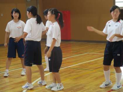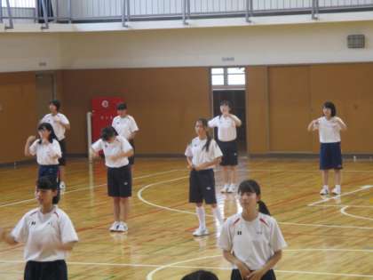 体育館でダンスの隊形を確認しながら、自主的に練習に取り組んでいます。