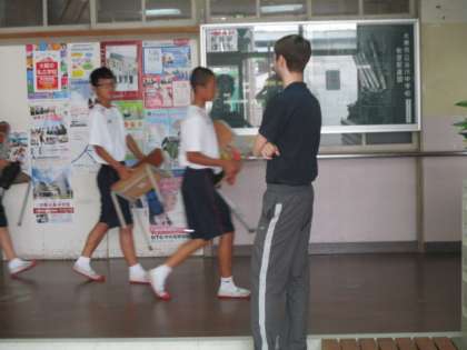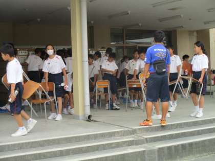 安全面に十分注意を払い生徒席に向かっています。AETの先生も生徒の移動を見守っています。
