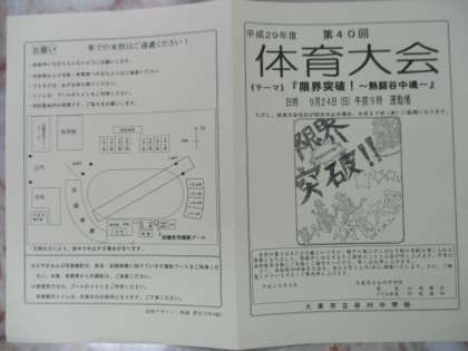 おはようございます。本日、大東市立谷川中学校第40回体育大会を行います。多数の方にご観覧いただければ幸いです。午前9時スタートです。