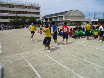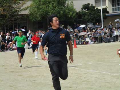 白熱したリレーです。仲間を励ます姿が微笑ましかったです。教職員も参戦です。