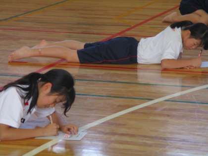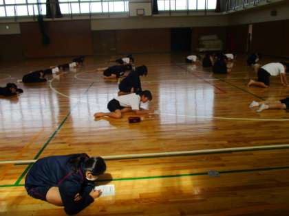 2年3,4組の女子体育の授業風景です。今日が剣道最後の授業です。授業最初に筆記試験に挑んでいます。