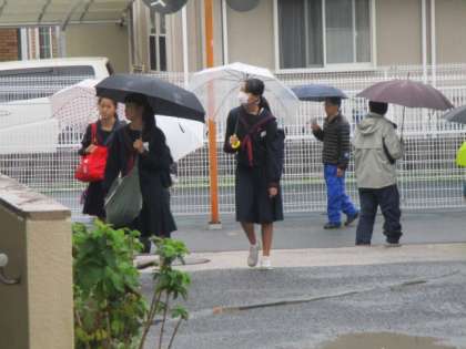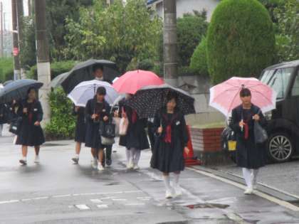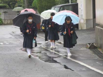 また今日も雨の中、登校です。地域の野村さん、中川さんがカッパを着て校門で生徒たちを迎えてくれます。感謝の気持ちでいっぱいです。