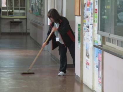 校務員さんが廊下の隅々まで丁寧に掃除をしています。