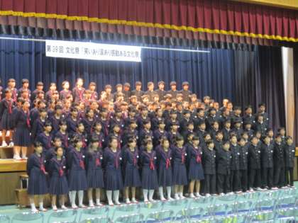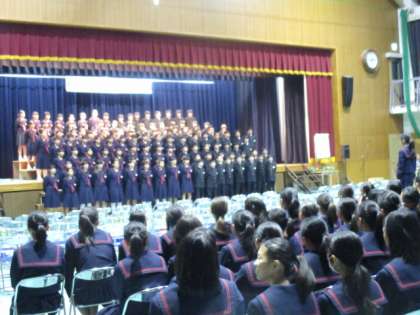 午後の最初のプログラムは1学年合唱です。合唱コンクールで金賞をとった1年1組の合唱と学年合唱です。学年合唱曲は「世界に1つだけの花」です。