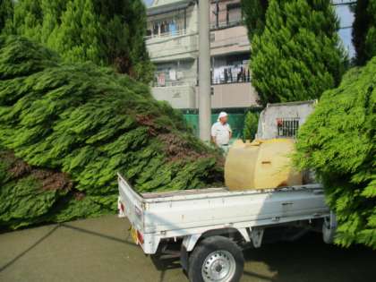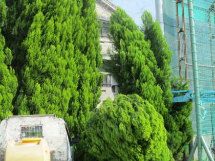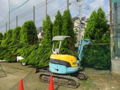 台風21号の影響でグランド北側のゴールドクエストが倒れてしましました。教育委員会のお取りはからいで今日、業者さんが来ていただき、木々を直す作業をしていただいています。本当に感謝です。