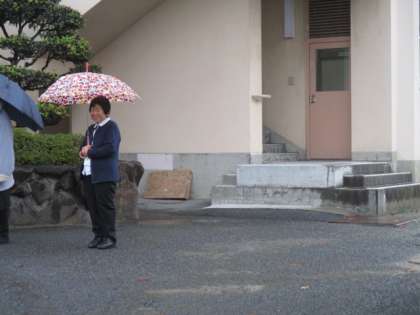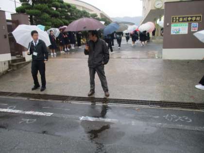 今日は保健室に中易先生が来校されています。私たちと一緒に校門に立って生徒を迎えていただいています。
