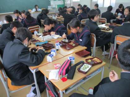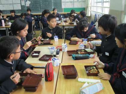 楽しく、美味しく食べています。1年1,2組の様子です。