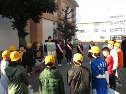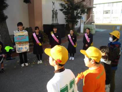 小学校に到着、挨拶運動開始です。