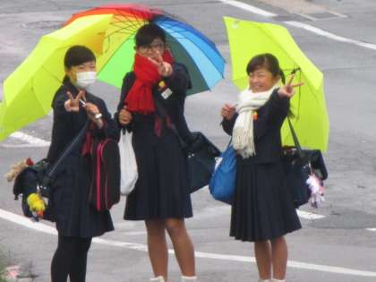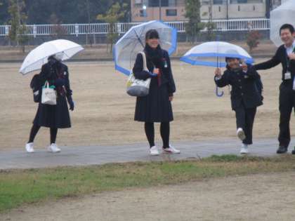 冷たい雨が降っていますが、生徒たちは安全面に気をつけて学校に向かいます。