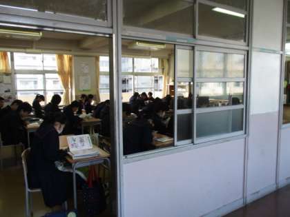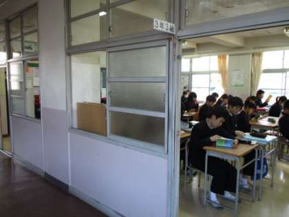 朝読の10分間、窓、扉を全開して換気に努めています。寒いですが生徒たちは換気の主旨を理解し協力しています。