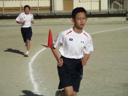 1年男子持久走です。仲間から「頑張れ」という励ましの声が運動場に響いています。
