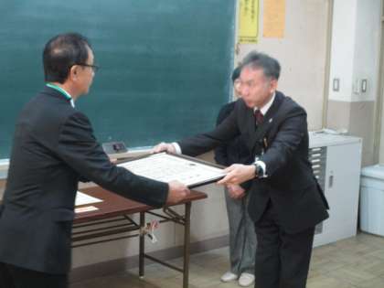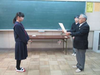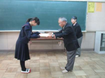 本日、第65回中学生人権作文コンテストの表彰で大阪法務局人権擁護部第三課課長様、大東地区人権擁護委員様が本校に来ていただきました。谷川中学校が学校賞を受賞し、井上楓菜さんが大阪第二人権擁護委員会長賞と大東地区人権擁護委員会長賞を受賞しました。
