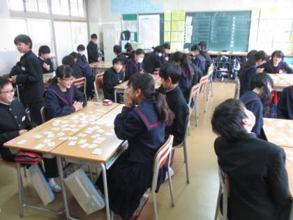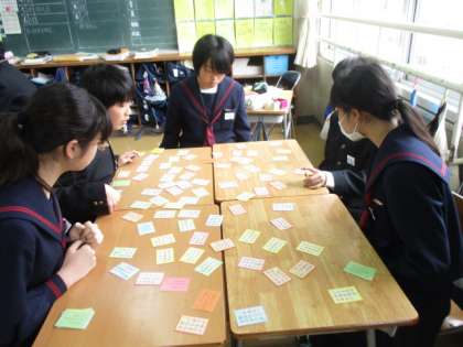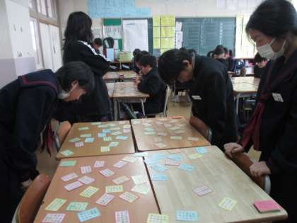 1年1組の授業風景です。班ごとにカルタをしていました。