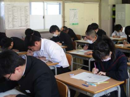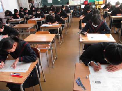 中学校最後のテストです。教室の雰囲気が今までとは違います。1,2組の様子です。