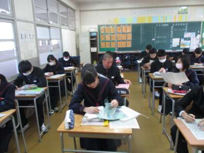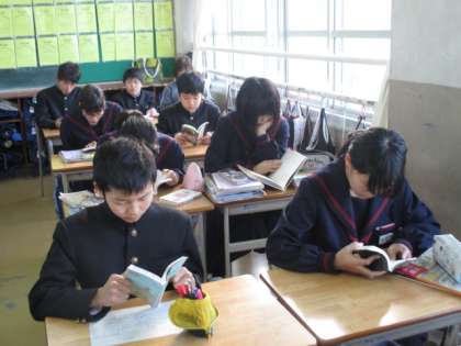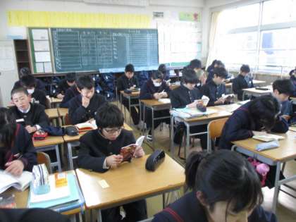 今日は4組です。3年生は卒業テストですので試験勉強をしています。1,2年生は朝の読書に取り組んでいます。