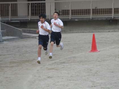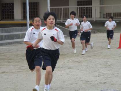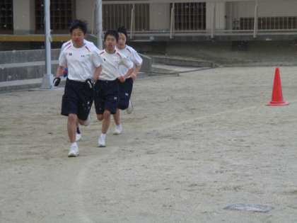 雪が舞う中、1年1,2組男子が元気よく走っています。