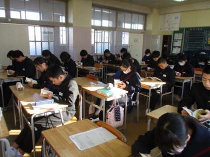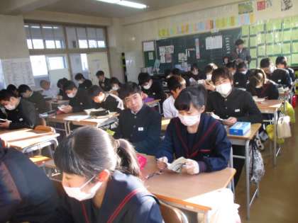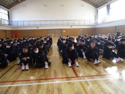 1年生は体育館で学年集会です。2,3年生は2組の様子です。