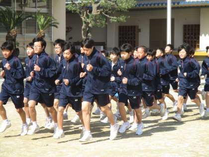 1年生は男子体育で寒い中、気合いの入ったかけ声でランニングをしていました。