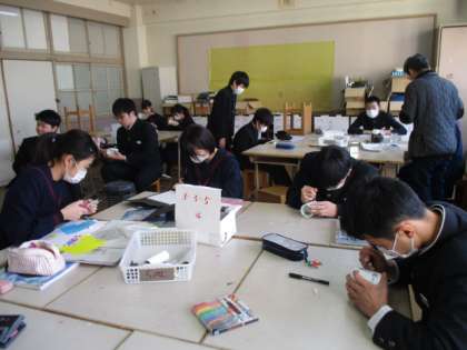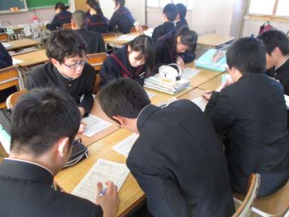 2年生は理科の授業、インフルエンザで休んでいた生徒は前席あたりに集まり、休んでいたところを学習していまし。休んでいなかった生徒は後ろ席に集まりプリント学習を行っていました。