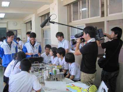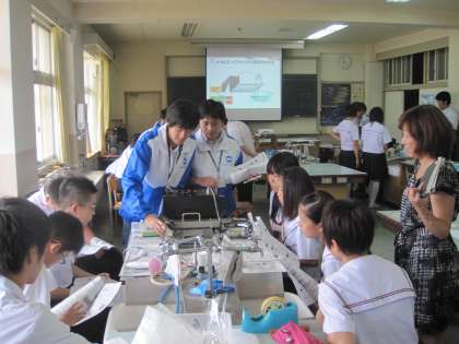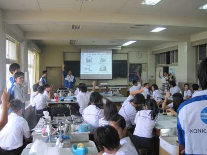 本日、コニカミノルタ株式会社さんから10名ほどお越しいただき、理科の授業「コピー機を使って静電気の学習」をしていただいています。