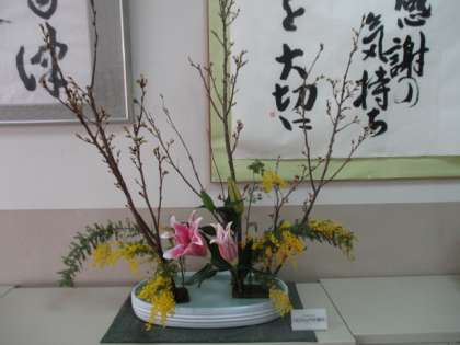 通勤してくると昨日の夕方、いけていただいたお花にとても癒やされました。今日も頑張りましょう!!。桜・ミモザ・ゆりです。